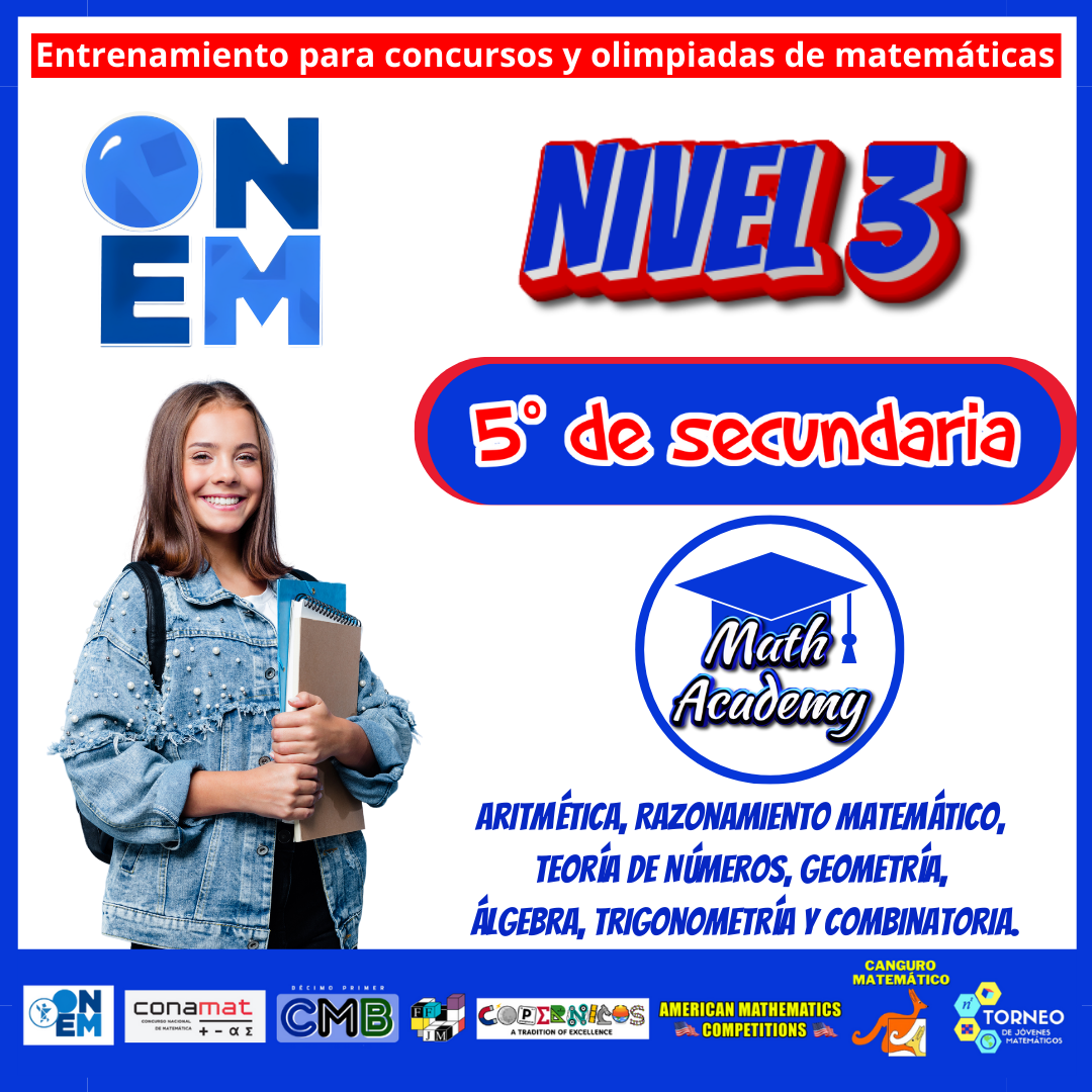 Entrenamiento para concursos y olimpiadas de Matemáticas dirigido a alumnos de 5° de secundaria donde se trabaja en función de los temas de la Olimpiada Nacional Escolar de Matemática ONEM, por lo cual, los estudiantes estarán preparados para muchos otros concursos que se realizan a nivel nacional e internacional. Los cursos que se enseñan son Aritmética, Razonamiento Matemático, Trigonometría, Teoría de Números, Geometría, Álgebra y Combinatoria.
